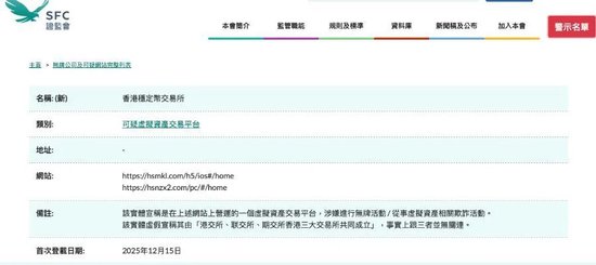 这份文件落款为“香港稳定币交易所市场监察部”。而记者注意到,香港证监会网站显示,12月15日,香港证监会将“香港稳定币交易所”列入可疑虚拟资产交易平台警示名单。香港证监会表示,该实体宣称是在上述网站上营运的一个虚拟资产交易平台,涉嫌进行无牌活动/从事虚拟资产相关欺诈活动。该实体虚假宣称其由“港交所、联交所、期交所香港三大交易所共同成立”,事实上跟三者并无关联。